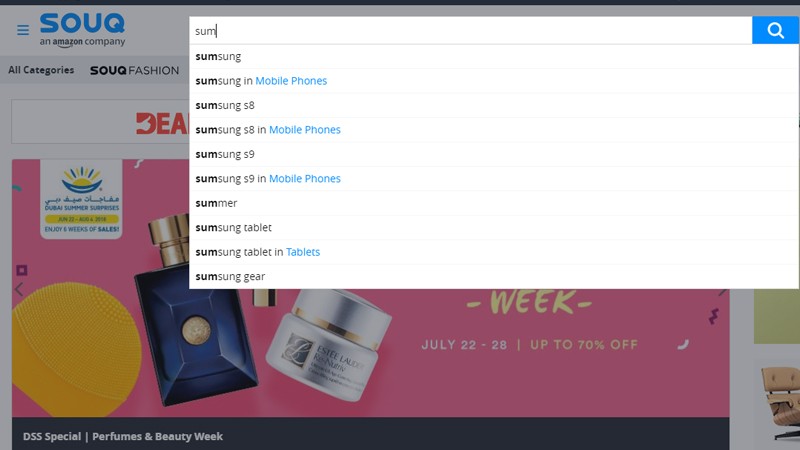 مرحله ی اول : ابتدا به آدرس اینترنتی https://uae.souq.com مراجعه نموده و مطابق آنچه در عکس زیر نشان داده شده است، در بخش جستجو، به جستجوی محصول مورد نظر خود بپردازید.